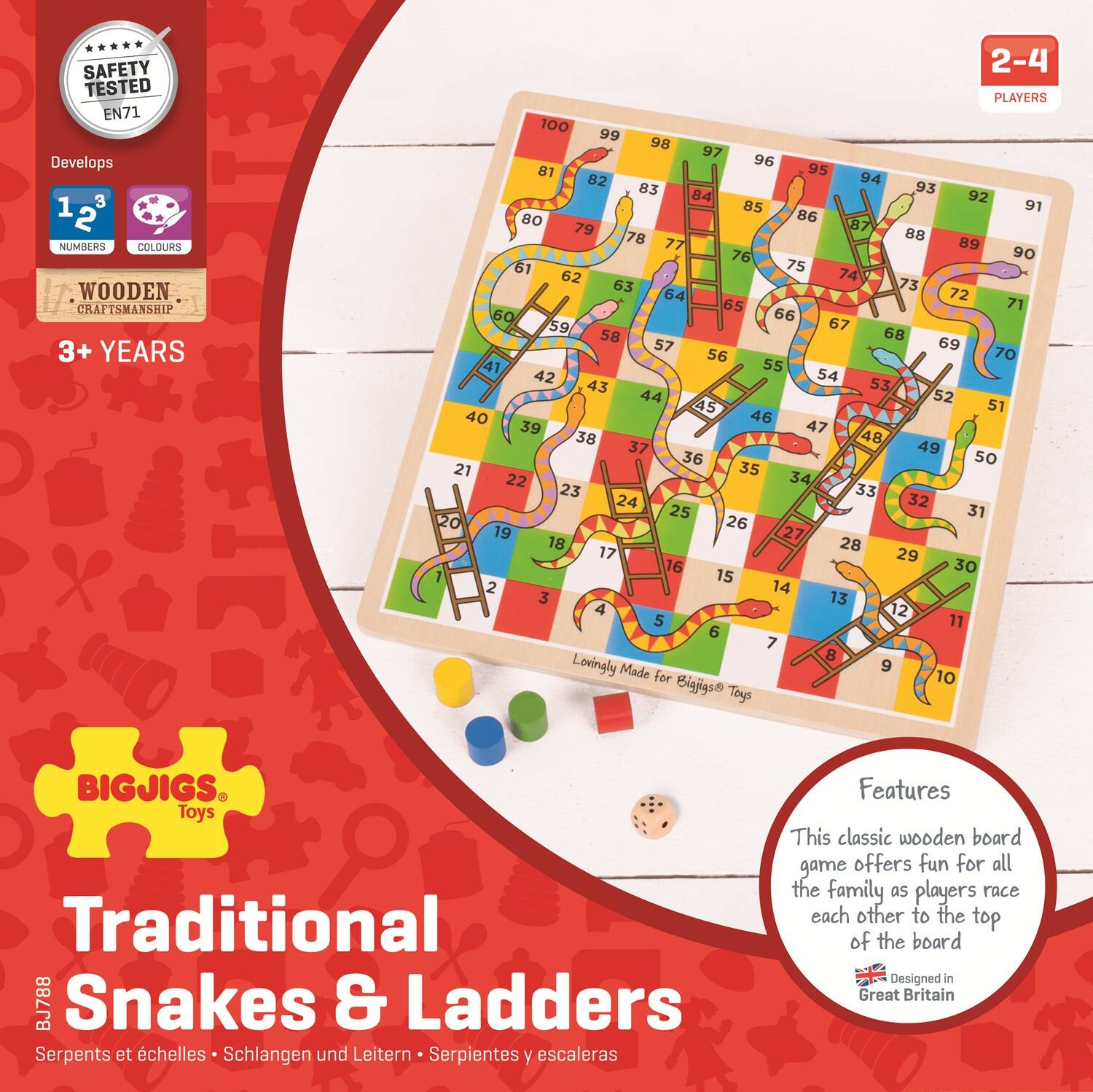 This classic wooden board game offers fun for all the family as players race each other to the top of the board. Skip squares when you land at the base of a ladder, but watch out for the head of a snake which will have you sliding all the way to the base of its tail! Made from high quality, responsibly sourced materials. Conforms to current European safety standards