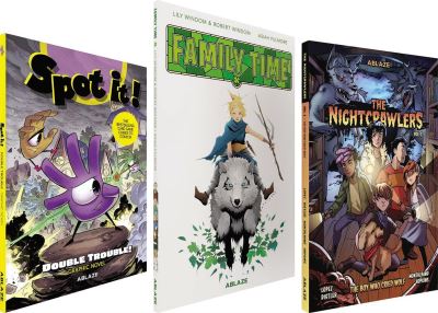 - ABLAZE is shining the spotlight on the wide variety of genres and fantastic works within our catalogue! Our Spotlight on Kids' Stories includes three comic titles - Family Time, The Nightcrawlers, and Spot It: Double Trouble - bundled together under a specially discounted price. In Family Time: The O'Connell family (Lily age 13; Tyler -age 11; and their parents) are vacationing in Ireland when they encounter an old man with a mysterious crystal that seemingly teleports 1,000 years back in time. Unsure whether they have stumbled into a historical reenactment, the family must befriend Rory, a timid local, battle a medieval tyrant named Ciaran and his henchmen, and figure out how to get back to the present, while Lily learns to use her newfound superpowers. In The Nightcrawlers: When things go bump in the night, they bump back. If you think aliens replaced your teachers or your neighbor might be a vampire, then there's only one group to call for help: The Nightcrawlers. The Nightcrawlers take on their first case when a friend from school believes werewolves replaced his parents. They get more than they bargained for when their investigation leads them into the middle of a confrontation between their caretaker William Jones and a former Nightcrawler out for revenge. This story is about the unlikeliest group of friends coming together to help others...with a spooky twist! A new all-ages, supernatural adventure about a group of supernatural kid detectives, by Eisner Award-winning writer Marco Lopez and artist-on-the-rise Rachel Distler. For fans of Goosebumps, Ghostbusters, The Goonies, and Stranger Things. In Spot It: Double Trouble: Meet Dobbly. He lives in a world filled with wonderful symbols that have power by finding matching pairs. This ne'er-do-well is so excited about his village's Festival of Matching, he can hardly sleep the night before. His impatience gets the best of him, and he finds himself trying to climb the Great Tree that will produce new pairs for the village. He also finds himself falling off the tree and breaking every branch on the way down, ruining the festival. It's now up to the wizard Zadok and his apprentice, the druidess Dea, to find the magical seeds needed to repair the tree. And Dobbly is tagging along for the adventure!