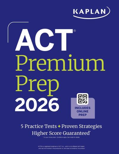 - Kaplan is an Official Teaching Partner of the ACT. Redesigned to reflect changes to the ACT, Kaplan's ACT Premium Prep 2026 has the detailed subject review, practice tests, and expert strategies you need to be prepared for test day. This ACT prep book includes hundreds of practice questions, 4 online practice tests, and video lessons from our experts to help you face test day with confidence. We're so certain that ACT Premium Prep offers the guidance you need that we guarantee it: After studying with our online resources and book, you'll score higher on the ACT-or you'll get your money back. Essential Review 5 full-length Kaplan practice tests with detailed answer explanations (1 printed in the book and 4 tests online) One-year access to our online center with additional Qbank and videos to help guide your study Optional Science and Writing preparation through your online center. Pre-quizzes to help you figure out what you already know and what you can skip Mixed practice quizzes after every chapter to assess how much you've learned A practice question at the beginning of each lesson to help you quickly identify its focus and dedicated practice questions after every lesson to test your comprehension Efficient Strategy "On Test Day" strategy notes in every math chapter to help you remember that the ACT math test is primarily a strategy test "Reflect" pages that help you evaluate your comfort level with the topics and make a plan for improving before the test after completing each chapter Online study-planning tool helps you target your prep no matter how much time you have before the test. Expert Guidance We know the test: Our learning engineers have put tens of thousands of hours into studying the ACT, and we use real data to design the most effective strategies and study plans. Kaplan's books and practice questions are written by veteran teachers who know students-every explanation is written to help you learn. We invented test prep-Kaplan (kaptest.com) has been helping students for over 80 years. Publisher's Note: Products purchased from 3rd party sellers are not guaranteed by the publisher for quality, authenticity, or access to any online entities included with the product.