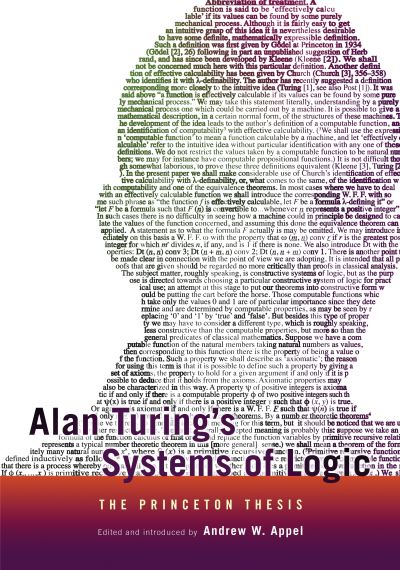 - A facsimile edition of Alan Turing's influential Princeton thesis Between inventing the concept of a universal computer in 1936 and breaking the German Enigma code during World War II, Alan Turing (1912-1954), the British founder of computer science and artificial intelligence, came to Princeton University to study mathematical logic. Some of the greatest logicians in the world-including Alonzo Church, Kurt Gödel, John von Neumann, and Stephen Kleene-were at Princeton in the 1930s, and they were working on ideas that would lay the groundwork for what would become known as computer science. This book presents a facsimile of the original typescript of Turing's fascinating and influential 1938 Princeton PhD thesis, one of the key documents in the history of mathematics and computer science. The book also features essays by Andrew Appel and Solomon Feferman that explain the still-unfolding significance of the ideas Turing developed at Princeton. A work of philosophy as well as mathematics, Turing's thesis envisions a practical goal-a logical system to formalize mathematical proofs so they can be checked mechanically. If every step of a theorem could be verified mechanically, the burden on intuition would be limited to the axioms. Turing's point, as Appel writes, is that "mathematical reasoning can be done, and should be done, in mechanizable formal logic." Turing's vision of "constructive systems of logic for practical use" has become reality: in the twenty-first century, automated "formal methods" are now routine. Presented here in its original form, this fascinating thesis is one of the key documents in the history of mathematics and computer science.