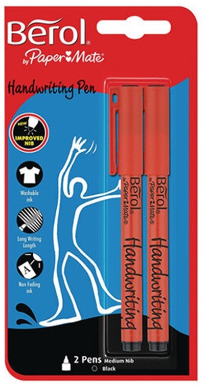 Get 2 Berol handwriting pens from Papermate, with black ink and a new improved nib. The ink is non-fading, and washable. The barrel is red, with a separate lid/clip. The barrel is fat for easy comfort and handling.