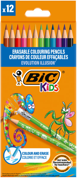 BIC Kids Evolution Illusion Erasable Colouring Pencils in an assorted pack of 12 colours.