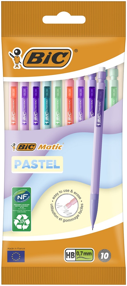 BIC Matic Pastel Mechanical Pencils (0.7 mm) with 9 cm Refill Leads - Assorted Pastel Barrel Colours, Pouch of 10