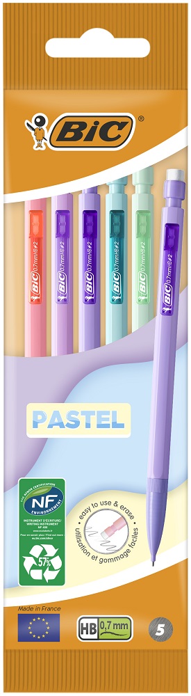 BIC Matic Pastel Mechanical Pencils (0.7 mm) with 9 cm Refill Leads - Assorted Pastel Barrel Colours, Pouch of 5