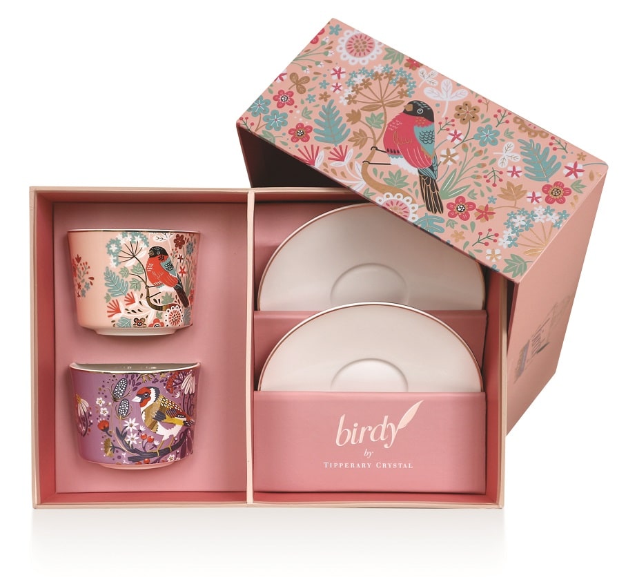 Birdy by Tipperary Crystal Bullfinch & Goldfinch Cappuccino Set