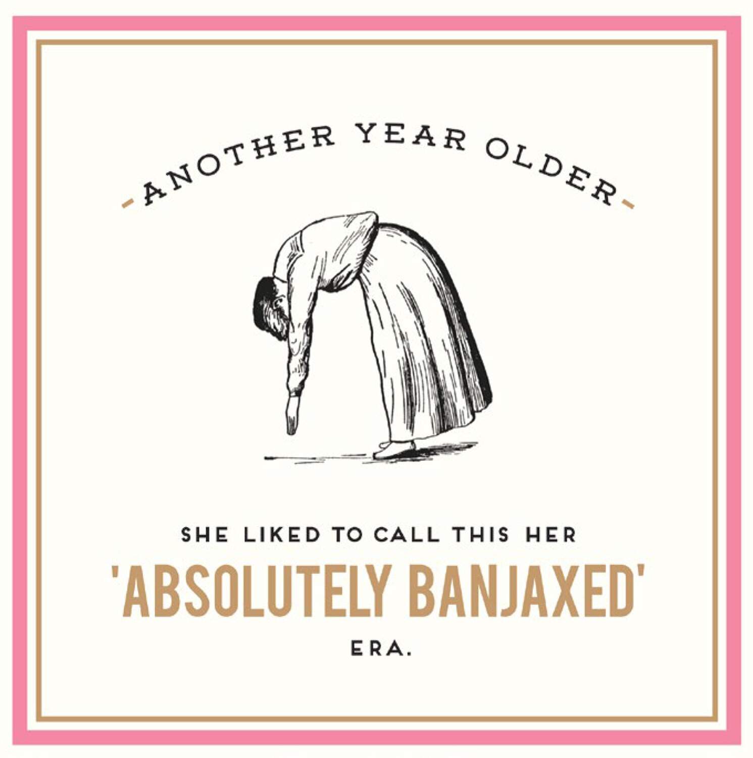 Celebrate someone's 'Absolutely Banjaxed' era with this hilarious card. Stylish design with a pink frame, funny artwork and bold foiled lettering. Supplied with envelope. Dimensions: 160 x 160mm. Inside Message: Happy Birthday