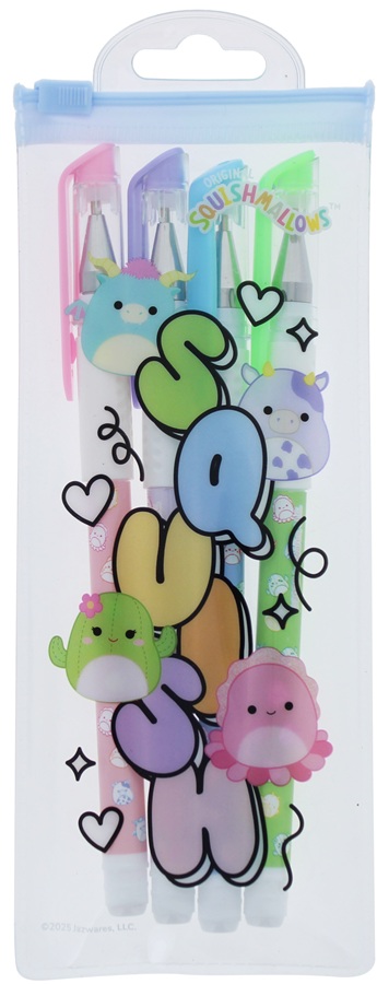 Add a bit of colour to your life with this set of 4 Squishmallows gel pens. Choose between the pink, blue, green or purple. Each barrel features images of some of your favourite Squishmallows characters. So, you can pick between using each of these pens, or just swap between them all. They all come within a reusable zip lock wallet so you can take them wherever you go.