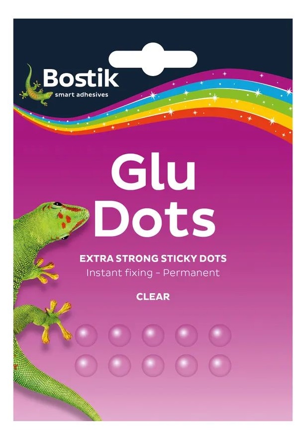 Bostik Extra Strong Glu Dots are circles of clear extra strong glue that stick to almost anything, including paper, wood, plastic, metal, glass and painted surfaces.