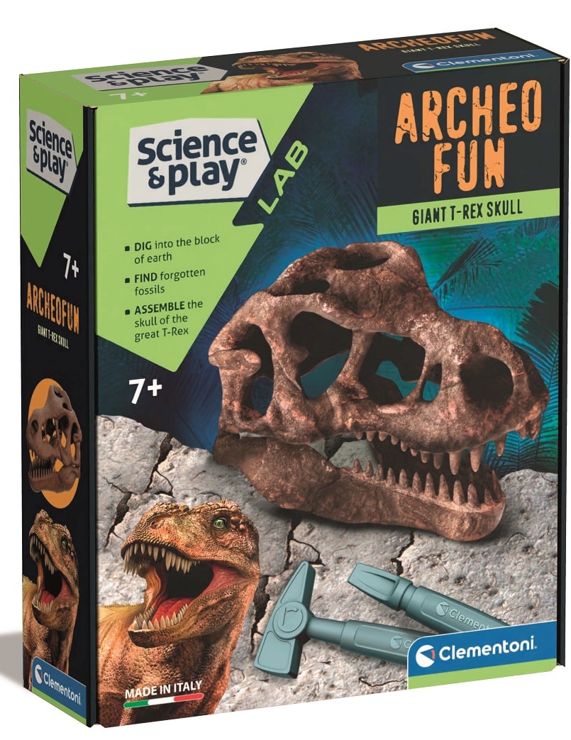 A scientific activity that teaches children about the most fearsome dinosaurs of the Jurassic period! The set includes a plaster-of-Paris brick that kids can chip at with a hammer and chisel to retrieve all the parts of a T-rex skull. Children will have fun putting the skull back together again just like a real palaeontologist! The detailed manual contains a lot of information and fun facts about dinosaurs! Devised and designed in Italy.