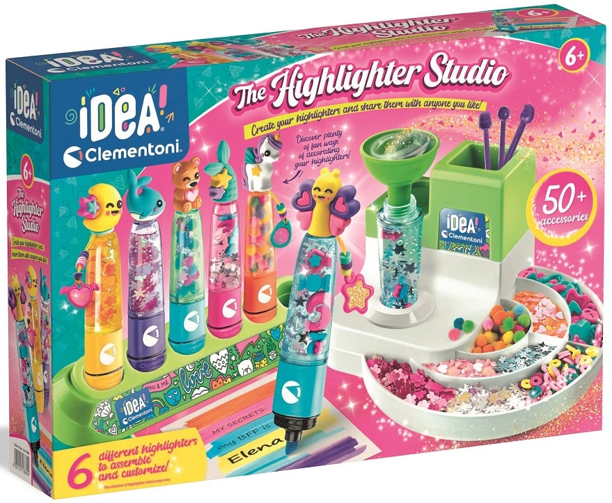 A creative and original laboratory that can be used to assemble charming highlighters A handy and richly assorted kit containing filters, tips, inks, characters and all the essential tools for making highlighters It’s a very easy process: immerse the filter in the ink, insert it in a base, add the tip and close all elements with the cap The new Idea game allows children to create and personalise their highlighter pens with lots of accessories and colours There’s much more to it than simply personalising a highlighter pen: children can create by unleashing their imagination