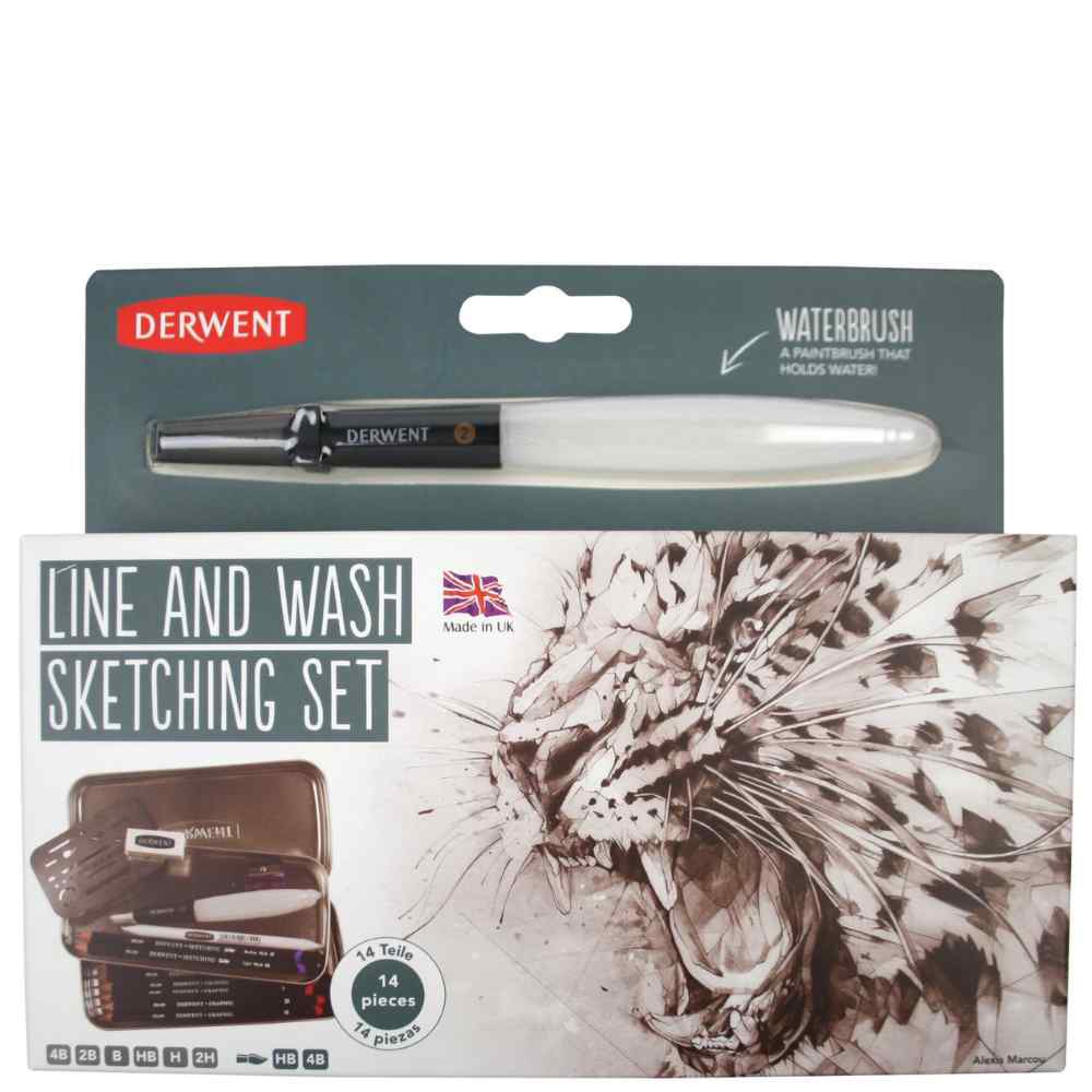 Contents: 1x Line and Wash Sketching Set (6 Graphic Pencils: 4B, 2B, B, HB, H, 2H, 2 Water-soluble Sketching Pencils: 4B, HB, Waterbrush, Eraser Shield, Paper Stump, Sharpener, Plastic Eraser)