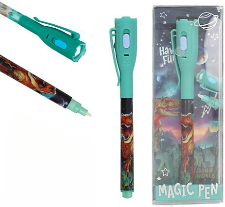 With the secret pen from Dino World, you can write down dinosaur-safe secret messages. The invisible ink of the secret pen only becomes visible when it is illuminated with the UV light integrated in the topper. Batteries included, but not replaceable.
