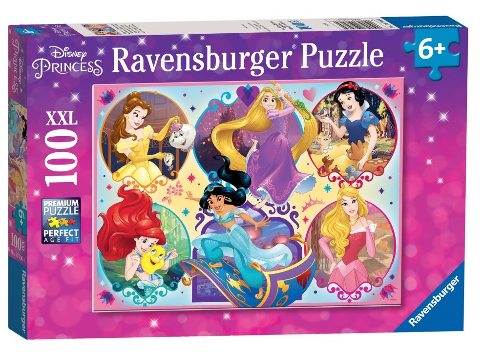 6 magical princesses can be pieced together in this Disney Princess Puzzle. Belle, Rapunzel, Snow White, Ariel, Jasmine and Cinderella are all featured in this wonderful 100pc puzzle. Our 100 piece kids puzzles with XXL large pieces are crafted with FSC premium quality and measure 49 x 36cm when complete. Great puzzles for Children 6 years old and up. Fully complies with all necessary UK and EU testing standards.
