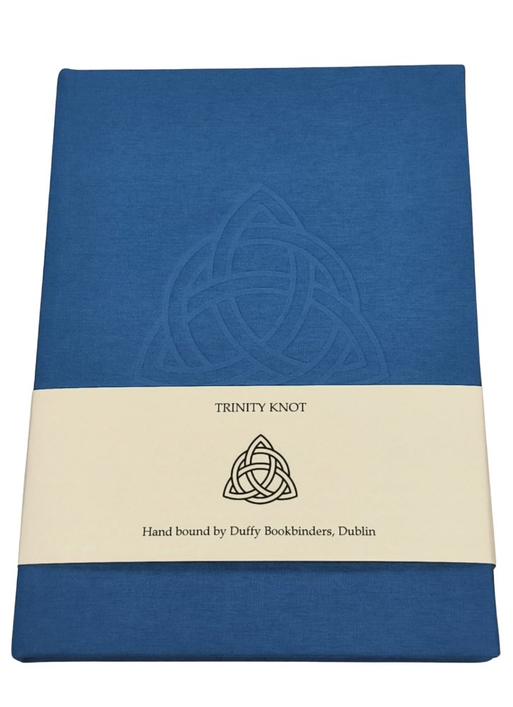 Our hand bound notebooks are known for their quality and durability, and are well regarded for many uses, be it writing, sketching or drawing. They are bound using high quality linen finish book cloths. They are blank, unruled, 160gm ivory paper and feature a blind debossed image of the Trinity Knot.