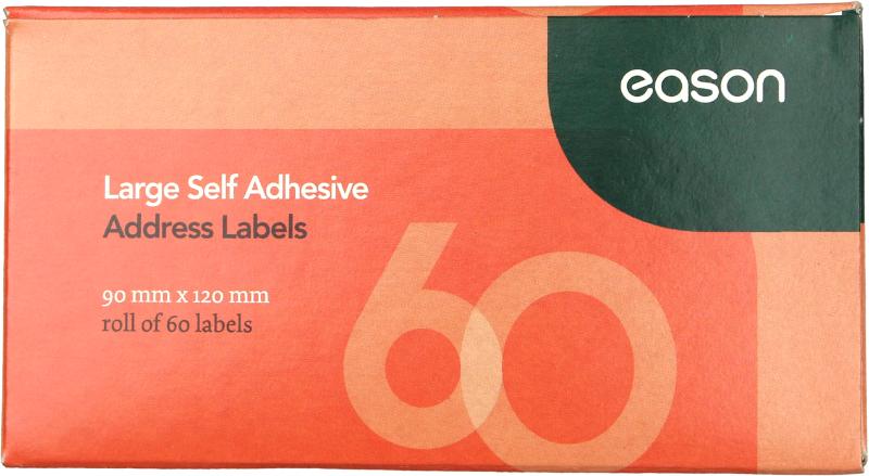Eason Box 60 Large Address Labels measure 120x90mm, ideal for oversized envelopes or parcels. With 60 labels in a pack, they're perfect for bulk mailing. Easy to peel and stick, these self-adhesive labels ensure your packages arrive at their destination quickly and clearly labelled.
