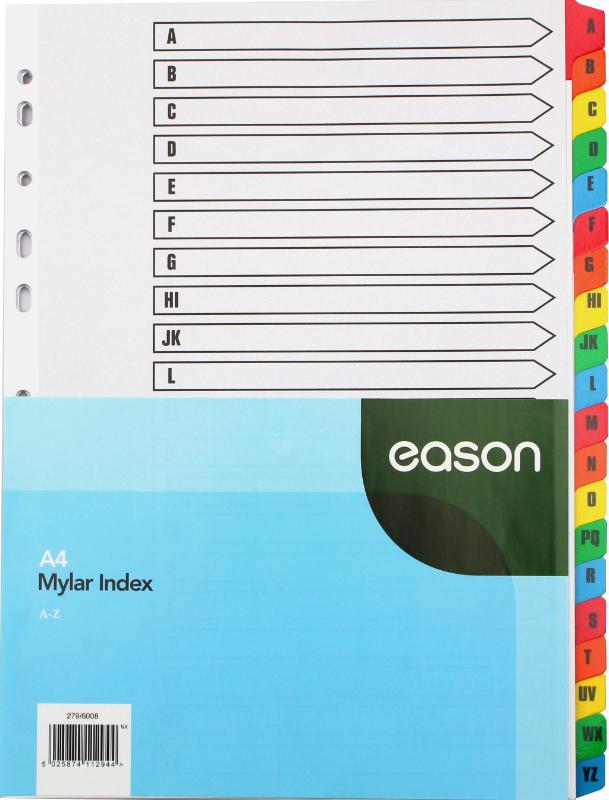 Tame your paperwork with Easons' A-Z Mylar Index Dividers. Crafted from ultra-durable mylar, these dividers resist tears and wear, making them ideal for high-traffic filing systems.
