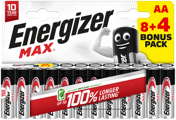 12-pack of Energizer Max AA batteries, Alkaline Longest Lasting: Up to 100% longer lasting than an Energizer basic alkaline battery in digital cameras Trusted Power: Double A batteries for cameras, doorbells, controllers, clocks and more of your everyday devices Leak Protection: Double A batteries with leak-resistant construction to protect your devices against leaks; covered under the Energizer No Leak Guarantee Includes recycled materials *Steel up to 10% Recycled. AA/AAA Only. Specially marked packages Reliable: Each Energizer alkaline AA battery boasts up to 10 years’ shelf life, so they’re ready when you need them 100% Recyclable Packaging: Energizer packaging is 100% recyclable, supports responsible forestry, and is plastic-free, excluding seals on select packaging