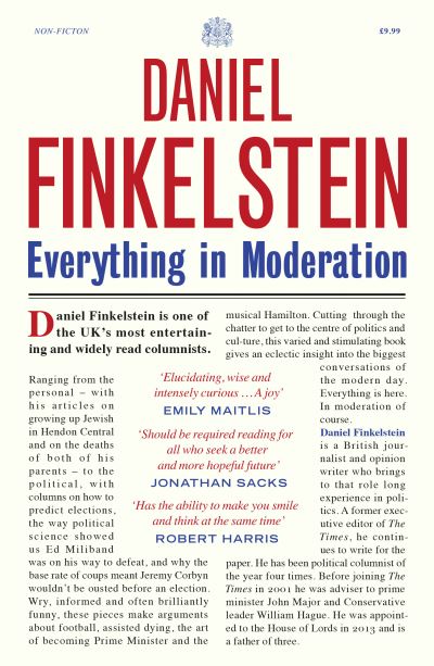 - 'I've never met Danny Finkelstein but I think I'm in love with him. His book is such good company - sane, intelligent and witty. He deals with serious subjects in an immensely readable way … If I'm asked to nominate my book of the year, this will be it' WENDY COPEWriting on everything from a defence of suburban life and moderate politics to big ideas and pop culture, Daniel Finkelstein is one of the UK's most entertaining and widely read columnists.This collection brings together Finkelstein's greatest writings from The Times, ranging from the personal - with his articles on growing up Jewish in Hendon Central and on the deaths of both of his parents - to the political, with columns on how to predict elections, the way political science showed us Ed Miliband was on his way to defeat, and why the base rate of coups meant Jeremy Corbyn wouldn't be ousted before an election.Wry, informed and often brilliantly funny, these pieces zip between Walt Disney, Hilary Clinton, David Bowie, Margaret Thatcher, Clement Attlee and Muhammed Ali. They make arguments about football, assisted dying, the art of becoming Prime Minister and the musical Hamilton. Cutting through the chatter to get to the centre of politics and culture, this varied and stimulating book gives an eclectic insight into the biggest conversations of the modern day. Everything is here. In moderation of course.