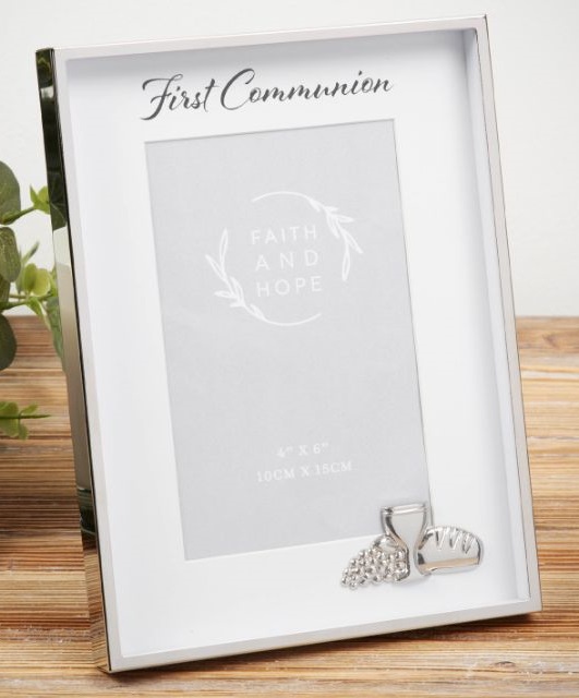 4" x 6" (10 x 15cm) portait aperture. Silver foil embossed FIRST COMMUNION title. Silver plated bread and wine icon. Crisp white mount. Luxury black velveteen standing strut. Hanging hook. Branded gift box