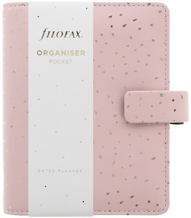 This Filofax Pocket Confetti rose quartz organiser features a playful pattern in beautiful colours. The organiser has a smooth patterned cover material with a sleek strap closure. The interior is in contrasting colours with various internal pockets. Comes complete with an year planner and a selection of undated papers. Paper size 81mm x 120mm.