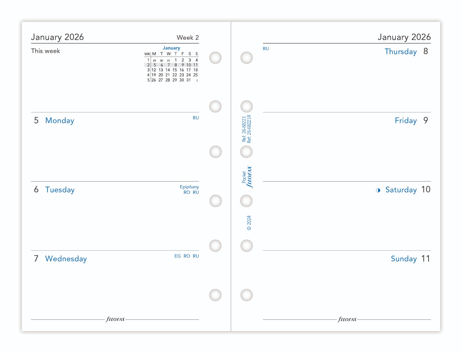 - This Filofax Pocket 2026 diary is a week on two pages format in English, with the week to view starting on a Monday. The diary is printed on white paper and runs from January to December 2026. Paper size 81mm x 120mm, drilled with six round holes.