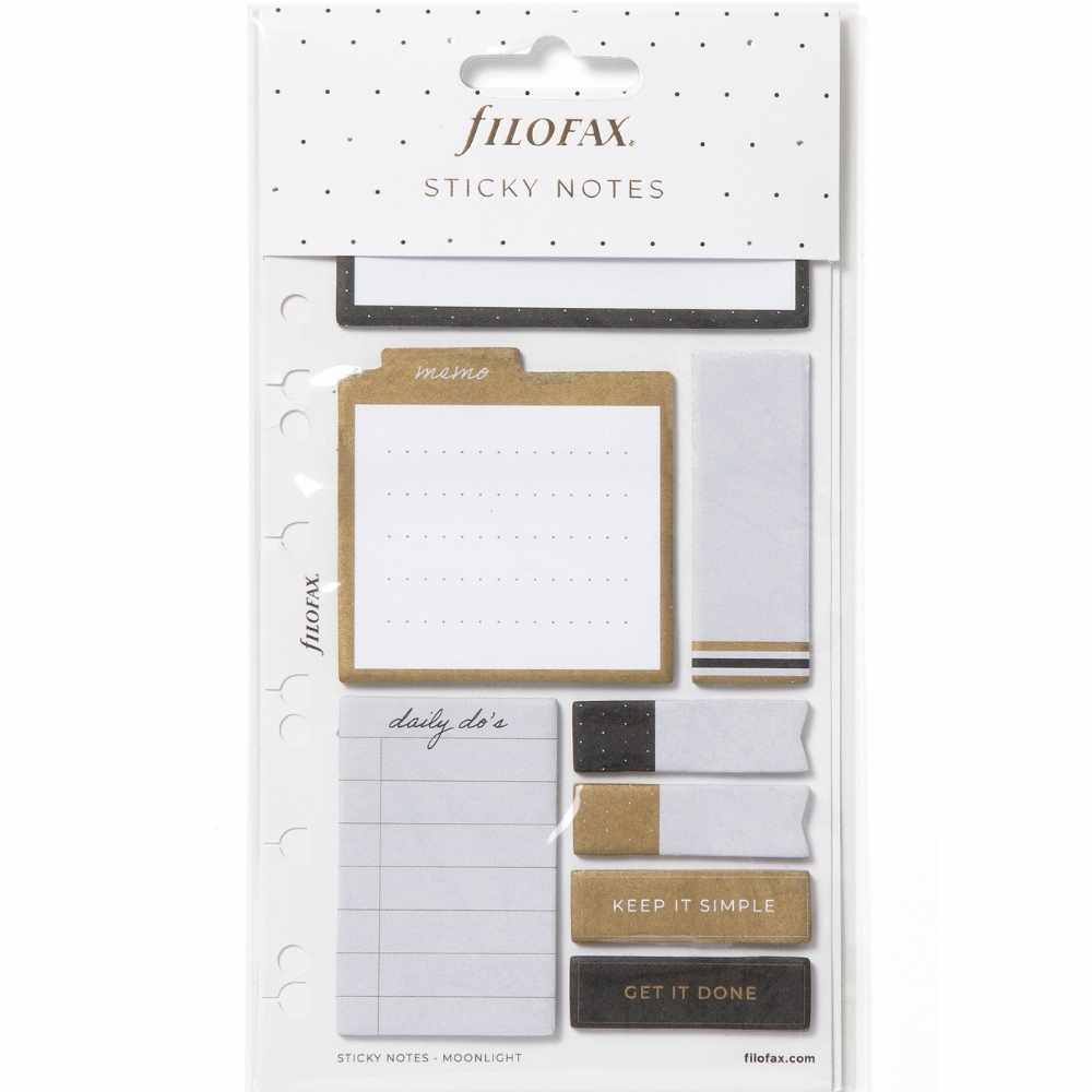 Part of the accessories for the beautiful new Moonlight range of organisers and refillable notebooks, but perfect to use with any Filofax Personal or A5 organiser, Personal or A5 Clipbook or our A5 refillable notebook. The sticky notes are repositionable. The set features four notepads - 1 each lined, blank, vertical and To Do - and four different horizontal page marker tabs. 25 sheets per pad. Total size 95mm x 164mm.