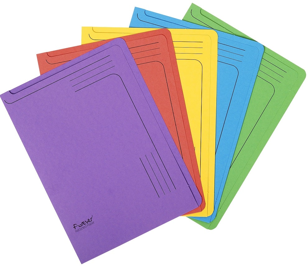 Exacompta Forever recycled slip files, A4 opens on 2 sides for easy access, holds 30 sheets, spaces for title on top , side & back of file. Can be used in suspension file or upright on shelf. Assortment Line.