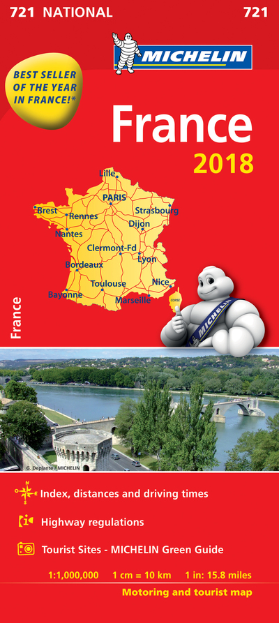 - Updated annually, the best selling MICHELIN National Map of France (map 721) will give you an overall picture of your journey in France thanks to its clear and accurate mapping scale 1/1,000,000. Our map will help you easily plan your safe and enjoyable journey in France thanks to a comprehensive key, a complete name index as well a clever time & distance chart. Michelin';s driving information will help you navigate safely in all circumstances. In addition, MICHELIN National Map France is cross-referenced with the famous MICHELIN Green Guide highlighting destinations worth stopping for! With MICHELIN National Maps, find more than just your way! MICHELIN NATIONAL MAPS feature: * Up-to-date mapping * A scale adapted to the size of the country * A clear and comprehensive key * Distance and time chart * Place name index * Driving and road safety information * Tourist sights information Our maps are regularly updated even if the ISBN does not change.
