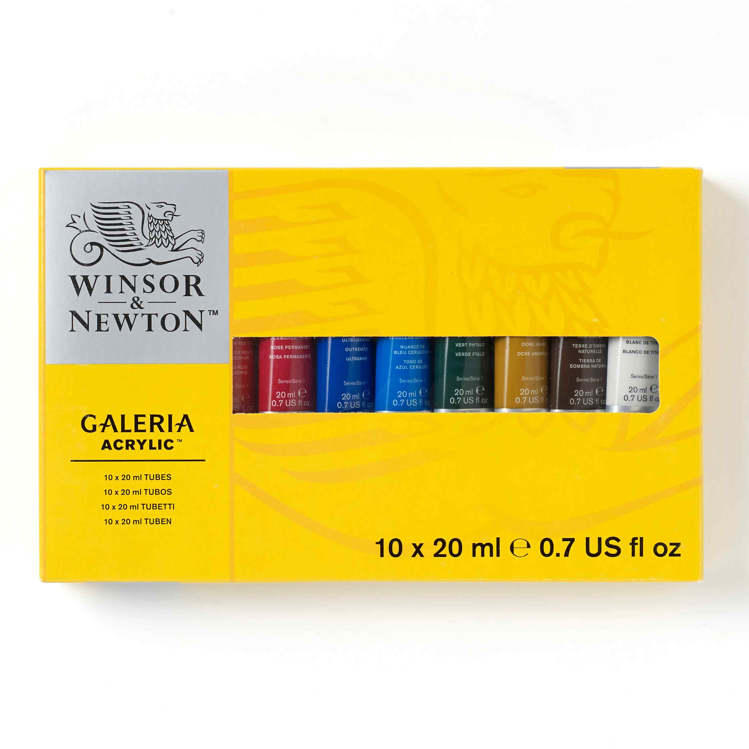 This set contains a selection of 10 tubes of 20ml Galeria Acrylic in popular colours. Includes: Lemon Yellow Hue, Cadmium Yellow Medium Hue, Cadmium Red Hue, Permanent Rose, Ultramarine, Cerulean Blue Hue, Phthalo Green (Blue Shade), Yellow Ochre, Raw Umber, Titanium White. Actual contents may vary.