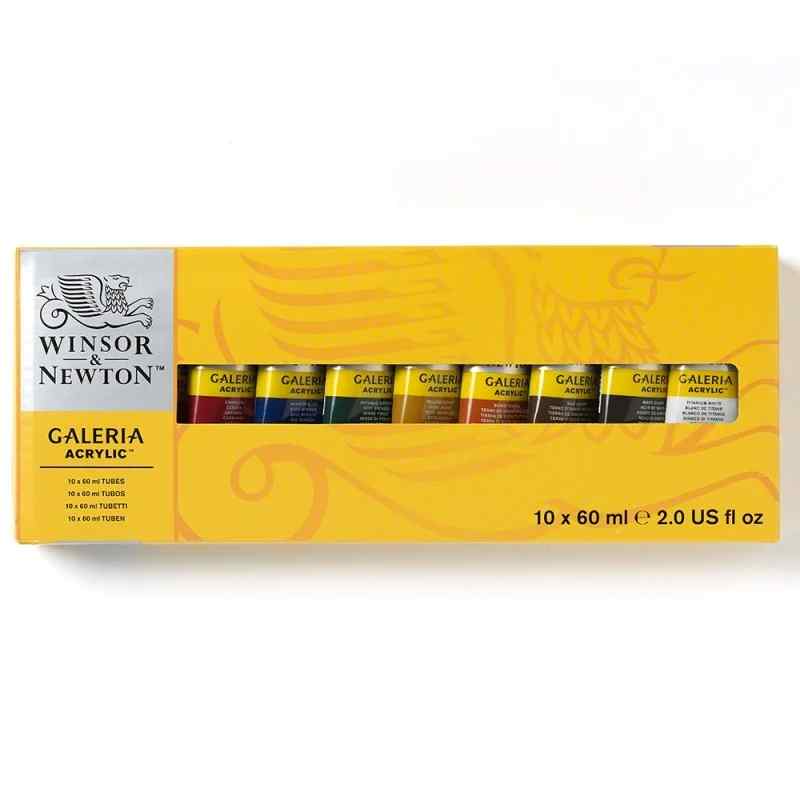 This set contains a wider selection of 10 x 60ml tubes and a leaflet. Includes: Cadmium Yellow Medium Hue, Cadmium Red Hue, Crimson, Winsor Blue (Red Shade), Phthalo Green (Blue Shade), Yellow Ochre, Burnt Sienna, Raw Umber, Mars Black, Titanium White. Actual contents may vary.