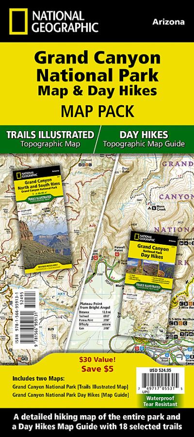 - Waterproof Tear-Resistant Topographic Maps. Grand Canyon is one of the most spectacular examples of erosion anywhere in the world-unmatched in the incomparable vistas it offers visitors from the rim. This two title Map Pack Bundle helps explorers of all levels see everything this astounding park has to offer. The map pack includes an overview map that shows the most visited sections of the North and South Rims as well as a Day Hikes map guide. With this combination of maps visitors can feel comfortable planning a trip to a park with options for everyone, from multi-day backpack trips to the 3.0 mile North Rim Lookout Tower Trail. The Grand Canyon National Park Day Hikes Topographic Map Guide includes seventeen diverse hikes for all hiking enthusiasts, the hikes range in difficulty and distance to help hikers select the best trail for their timing, abilities, and location within the parks. Each hike has a detailed map, a trail profile visualizing the changes in elevation, and a short summary of the interesting features encountered along the trip. The Grand Canyon Day Hikes and National Park Map Pack includes: - Map 261 :: Grand Canyon, North and South Rims - Map 1711 :: Grand Canyon Day Hikes Every Trails Illustrated map is printed on 'Backcountry Tough' waterproof, tear-resistant paper. A full UTM grid is printed on the map to aid with GPS navigation.