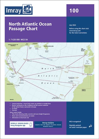 - At a scale of 1:7,620,000 this chart covers the North Atlantic from Brazil to Newfoundland and Gibraltar to the Caribbean. It has been constructed on a conical projection that means that Great Circle tracks can be plotted as straight lines rather than curves. Chart 100 shows the main trend of depth contours, limits of ice, magnetic variations and keys routes as identified by Donald M. Street Jr.In the enclosed booklet are pilot charts showing winds, currents and wave height frequencies with accompanying notes on favourable route timings and hurricane risk. Chart 100 is an important companion for Atlantic yachtsmen on passage and an excellent source of planning information. For this edition the magnetic variation curves have been replaced by a web link directing sailors to up to date information. The monthly diagrams indicating meteorological seasonal variations have been changed from March, June, September and December to May, June, November and December.