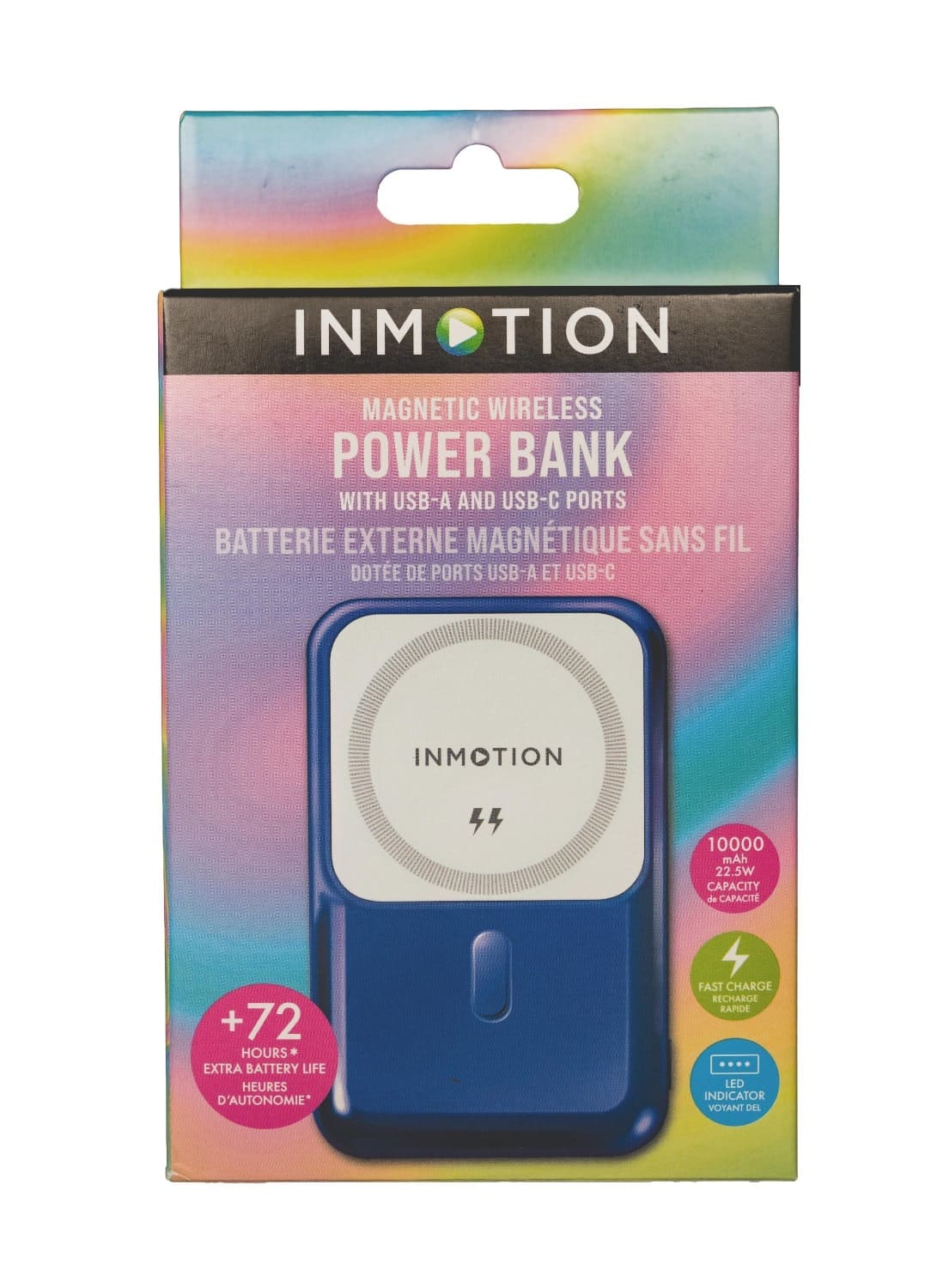 - The WHSmith InMotion 10K mAh Power Bank in GoodVibes Navy delivers powerful performance in a sleek finish. •Capacity: 10000 mAh •USB-C Input: DC 5V/3A, 9VDC/2A, 12VDC/1.5A •Wireless: 5W, 7.5W, 10W, 15W Max. •USB-C Output: DC 5V/3A, 9VDC/2A, 12VDC/1.5A 18W Max •USB-A Output: DC 4.5V/5A, DC 5V/4.5A, DC 5V/3A, DC 9V/2A, DC 12V/1.5A 22.5W Max. •Size: 108.8 x 69.5 x 16.9mm •Weight: 183g •Cable length: 0.25m •USB-C to USB-C cable provided