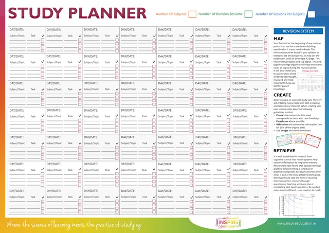 This Inspire Education Study Wall Planner is 420mm x 594mm in size. It has space for 49 revision days, excluding rest days, with up to four slots daily to allocate towards a revision topic/subject and the individual task. Students can also monitor their progress in the completion of tasks.