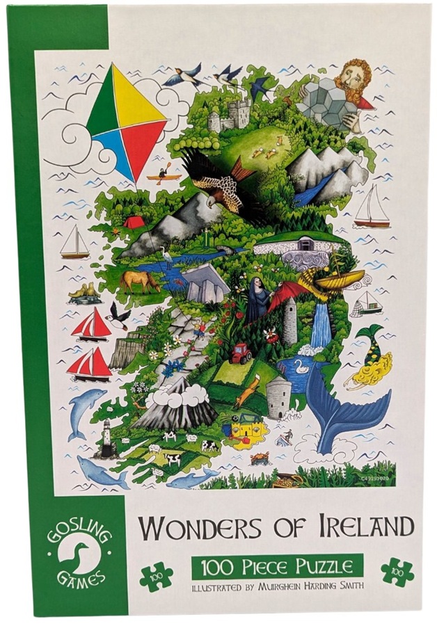 This 100 piece jigsaw is a colourful adventure through Ireland! Filled to the brim with Irish wildlife, nature, history and famous locations, there is so much in this puzzle for children to discover: from flying a kite in the Burren, climbing Carrauntoohil, whale watching off the coast, to the friendly giant watching over the Giant’s Causeway. When completed, this puzzle doubles as a discovery game. Can you spot all the hidden animals? Where is St. Patrick? Did you notice the fairy in the woods?