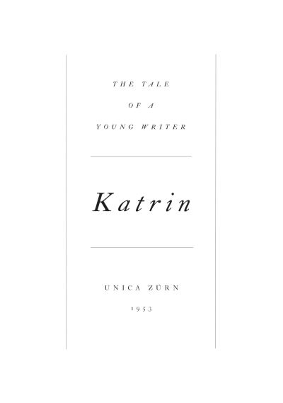 - Katrin. The Tale of a Young Writer is a novel by the artist Unica Zürn (Berlin 1916-Paris 1970). It was written in 1953, although it would never be published in her lifetime. This is the first translation of the tale from German into English. Zürn tells the story of fifteen-year-old motherless Katrin, an aspiring writer, who lives with her father, also a writer. The novel is set in an imaginary world, a metropolis called Linit, split into three levels: Oberstadt (Hightown), Mittelstadt (Middletown) and Unterstadt (Lowtown), overlooked by a Volcano where the artists live and crossed by the river Emil. Presented as a book for children, apparently written for her own daughter (named Katrin), Katrin also draws on the personal biography of Zürn herself, in terms of her relationship with her father and the city of Berlin after WWII, and her experience with people on the margins of a society characterised by great tensions.