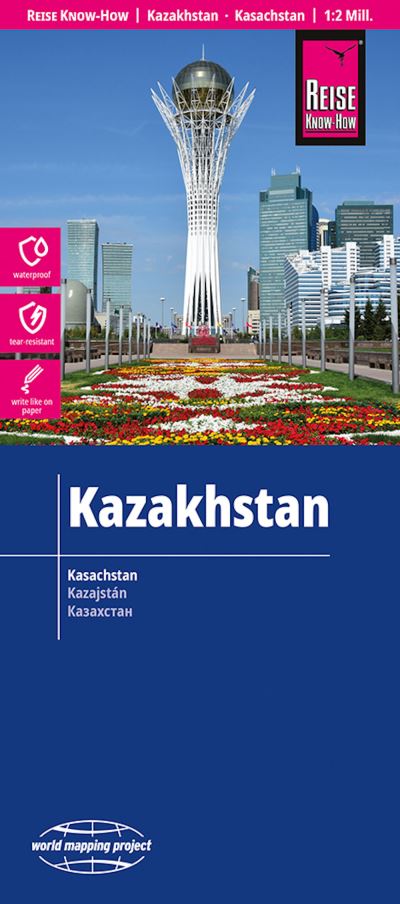 - Highly tear-resistant and 100% waterproof map of Kazakhstan from the world mapping project series. Reise Know-How maps are characterized by their particularly sturdy synthetic paper, which can be written on like paper, even with a pencil. The cardboard cover is removable, allowing the map to easily fit into any pocket. A protective cover is not required. The cartographic presentation focuses on the most important information for travelers and is particularly legible. Instead of shading, colored elevation layers are used. Contour lines with height information Colored elevation layers Classified road network with distance information Sightseeing features Detailed place index GPS-accurate Longitude and latitude Five-language legend (German, English, French, Spanish, Russian) Overview map on the cover