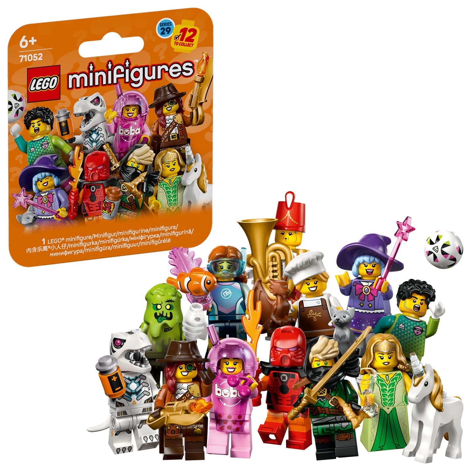 Each blind box contains 1 collectible LEGO minifigure from a total of 12 small toys to collect: Football Goalkeeper, Marine Biologist, Tuba Player, Unicorn Elf, Monster Hunter, Robot T. rex, Chocolatier, Boba Cup Fan, Bionicle Cosplayer, Mysterious Ronin, Cute Witch and Trash Monster.