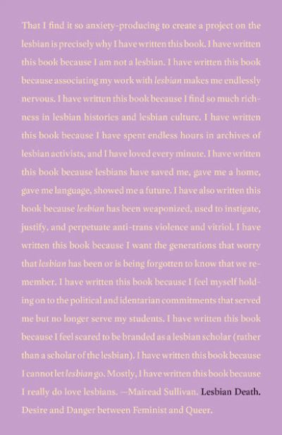 - Engaging with fears of lesbian death to explore the value of lesbian beyond identity The loss of lesbian spaces, as well as ideas of the lesbian as anachronistic has called into question the place of lesbian identity within our current culture. In Lesbian Death, Mairead Sullivan probes the perception that lesbian status is in retreat, exploring the political promises-and especially the failures-of lesbian feminism and its usefulness today. Lesbian Death reads how lesbian is conceptualized in relation to death from the 1970s onward to argue that lesbian offers disruptive potential. Lesbian Death examines the rise of lesbian breast cancer activism in San Francisco in conversation with ACT UP, the lesbian separatist manifestos "The C.L.I.T. Papers," the enduring specter of lesbian bed death, and the weaponization of lesbian identity against trans lives. By situating the lesbian as a border figure between feminist and queer, Lesbian Death offers a fresh perspective on the value of lesbian for both feminist and queer projects, even if her value is her death.