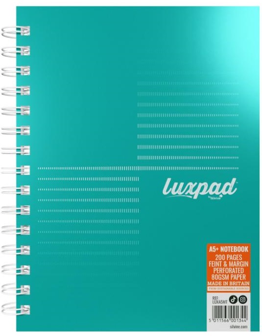 This A5+ wirebound notebook by Silvine is part of the Luxpad range. It features 200 pages of high quality 80gsm white paper, ruled 8mm feint with margin. The pages are micro-perforated and punched for filing while the wire binding allows the notebooks to lay flat and makes page turning a breeze. The Metallic Turquoise cover is gloss sealed making it more durable and offering additional wipeability. The paper is sourced from sustainable forests only, so you can scribble away safe in the knowledge that every last page is FSC certified and climate friendly. Book dimensions: 212 x 159.5 mm
