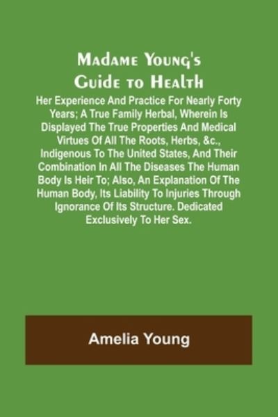 - This Book "Madame Young's Guide to Health; Her experience and practice for nearly forty years; a true family herbal, wherein is displayed the true properties and medical virtues of all the roots, herbs, &c., indigenous to the United States, and their combination in all the diseases the human body is heir to; also, an explanation of the human body, its liability to injuries through ignorance of its structure. Dedicated exclusively to her sex." has been considered important throughout the human history, and so that this work is never forgotten we have made efforts in its preservation by republishing this book in a modern format for present and future generations. This whole book has been reformatted, retyped and designed. These books are not made of scanned copies of their original work and hence the text is clear and readable.