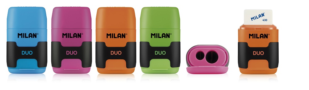 Combination of eraser with double pencil sharpener (standard and MAXI sizes) with deposit. COMPACT design, Duo series. Synthetic rubber squared eraser. The pencil sharpener has a sharp and resistant steel blade which makes it ideal for all varieties of pencils. Safety blade system which prevents the blade from becoming detached from the body of the pencil sharpener. 4 assorted colours: blue, orange, pink and green. Original design created by MILAN’s own R+D department. Spare 430 erasers available.