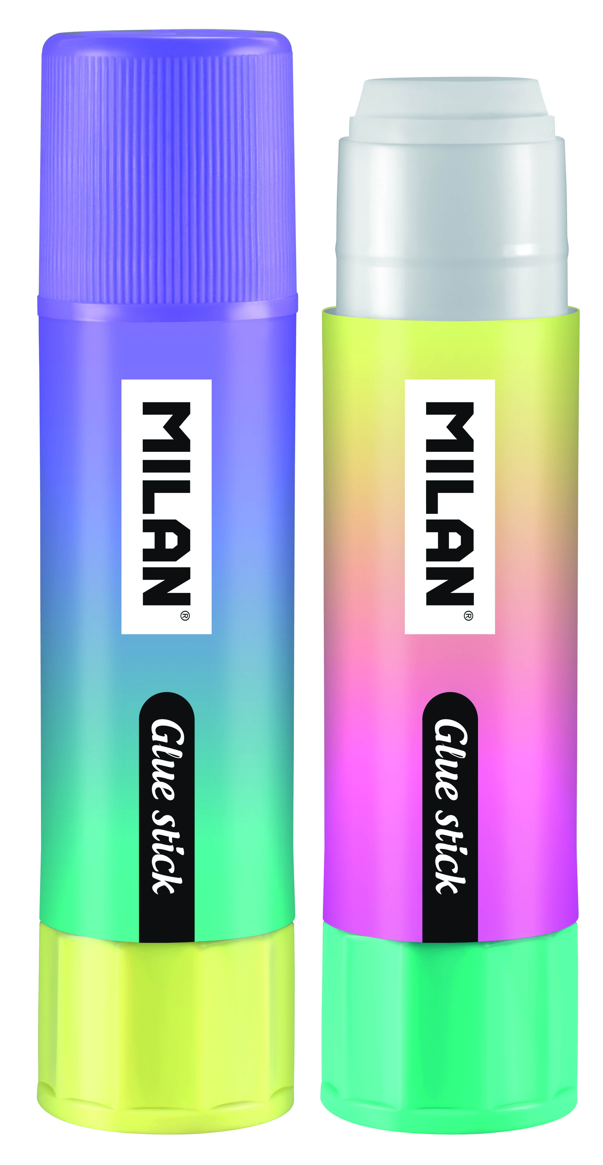 Assortment - One Chosen at random - 8 g Sunset series small glue stick. Multi-purpose: easily glues paper, cardboard, fabric, felt, cork, leather and foam. Solvent-free, ideal for school use. Size: 1.8 cm diameter and 8.3 cm length. 2 designs available (lilac and yellow).