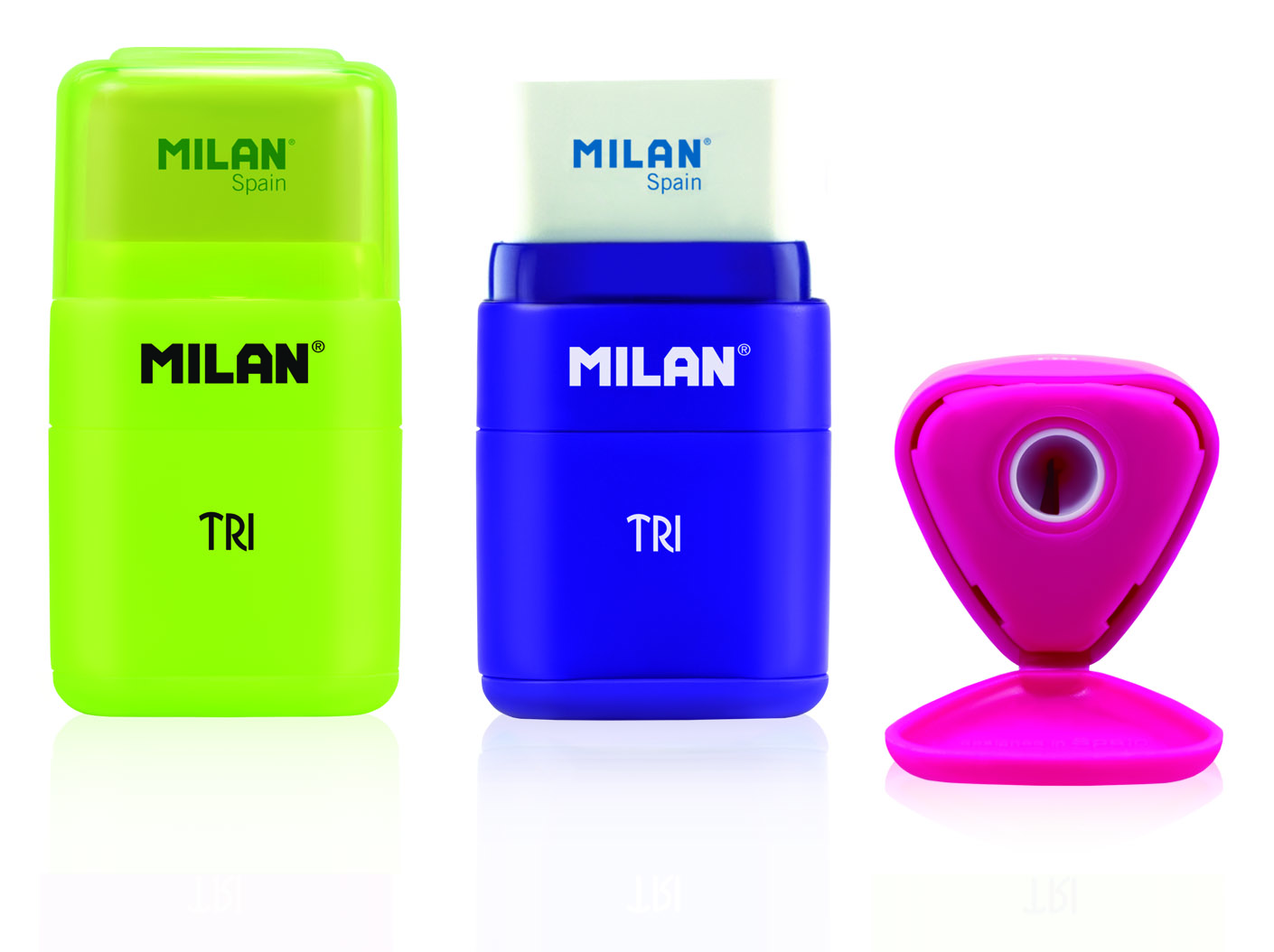 Combination of eraser with pencil sharpener with deposit. TRI design, Acid series. The pencil sharpener has a sharp and resistant steel blade which makes it ideal for all varieties of pencils. Safety blade system which prevents the blade from becoming detached from the body of the pencil sharpener. Original design created by MILAN’s own R+D department. Available in assorted colours: pink, blue and yellow. Spare erasers available.