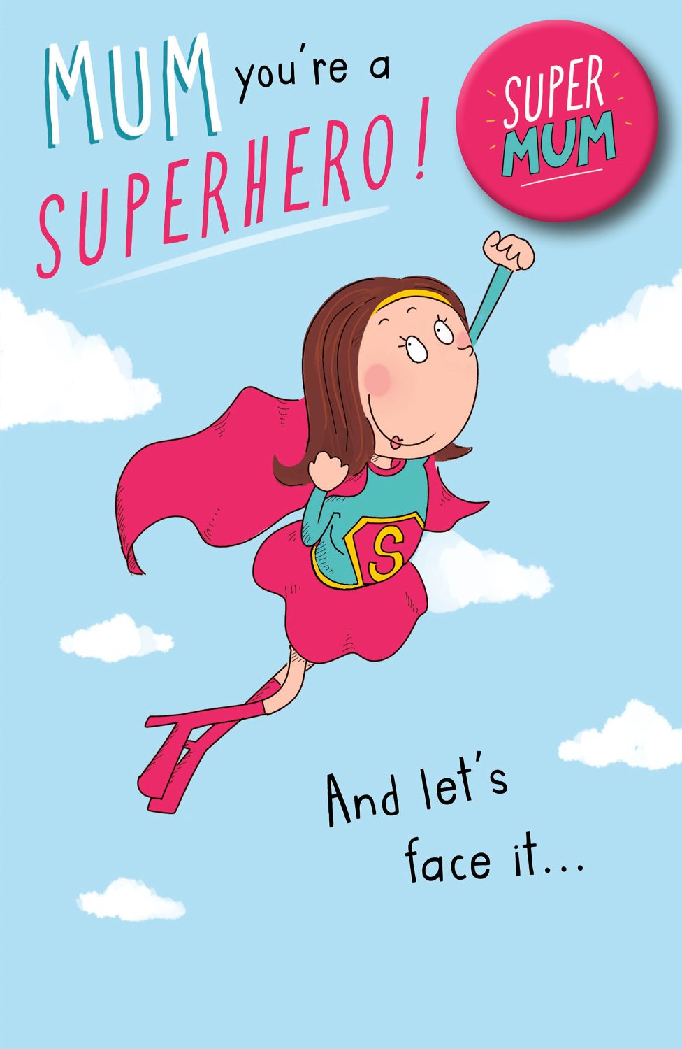 - Send a super mum a Mother’s Day wish with this funny card, illustrated with a superhero mum design and attached with a Super Mum button badge that’s sure to make her smile.