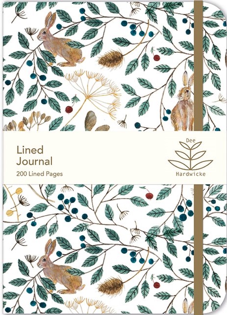 Dee Hardwicke Hares & Berries Elasticated A5 Lined Journal. Hard cover with round corners and expanding pocket. 200pp lined paper a branded bellyband. All paper is FSC certified.