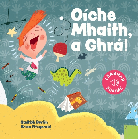 Oíche Mhaith, a Ghrá is a gentle Irish-language bedtime book with music and narration. It is ideal for families raising children with Irish. This 12-page sound book tells the story of a little boy who doesn’t want to go to bed.