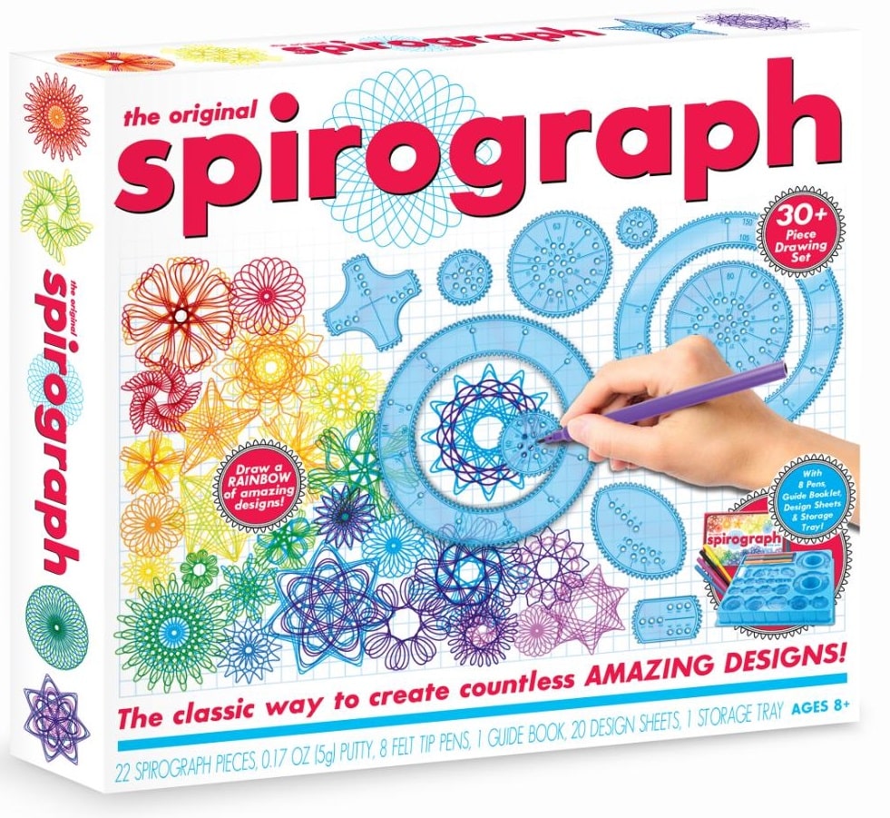 The Original Spirograph Kit combines the principles of art and mathematics that has delighted generations! This craft kit has precision engineered wheels and rings to work with most any pen, marker, or pencil, creating amazing spiral art! Inspired by the design of the original 1965 Spirograph, this set will entertain the whole family for years to come. This Spirograph set has everything you need to make endless amazing designs! Includes 19 wheels, 2 rings, 1 rack, 8 markers, spiro-putty, design paper, 14 page guide book, and storage tray. For ages 8 and up.