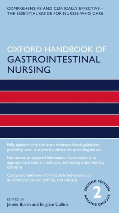 - Nurses must deliver up-to-date, clinically effective, evidence-based care across a range of settings and develop nursing services to meet changing demands. The thoroughly revised and restructured Oxford Handbook of Gastrointestinal Nursing 2nd edition is tailored to provide the essential knowledge nurses need; at their fingertips when they need it. This handbook will guide the reader through the care of patients with a wide range of conditions of the gastrointestinal tract. Each chapter is written in a consistent structure for ease-of-use, including symptoms, causes, investigations, and treatments. Key information is provided clearly and succinctly with tables and bullet points. Chapters cover everything from anatomy to the appropriate treatment or nursing care. It now includes new conditions including colorectal cancer, anal warts, cleft lip, and volvulus, as well as the enhanced recovery after surgery pathway. Providing key summaries of common problems and essential issues, it will provide both an invaluable reference for gastrointestinal nurses, as well as a precise, targeted guide for nurses from other specialties caring for patients with GI problems.