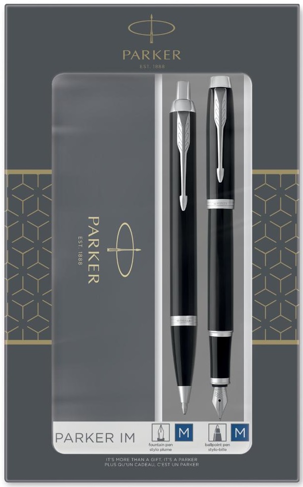 Parker IM Duo Gift Set with Ballpoint Pen & Fountain Pen | Gloss Black with Chrome Trim | Blue Ink Refill & Cartridge | Gift Box.At once smart, polished and professional, yet comfortable enough for daily use thanks to its ergonomic shape, Parker IM pens have a sleek, tapered look that pairs seamlessly with innovative designs to make a striking statement. Crafted with an intense gloss black lacquer body and accented in striking chrome trim, this Parker pen set makes a memorable gift for professionals looking to make their mark, as well as those who appreciate the slow art of expressing ideas on paper.